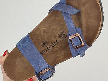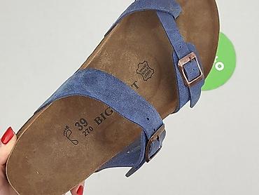 Damskie klapki w kolorze niebieskim - Model wsuwany, z zabudowaną górą z wycięciem pośrodku - Materiał wierzchni: miękka, gładka skóra ekologiczna (na połysk) - Wnętrze z jasną, przyjemną w dotyku...