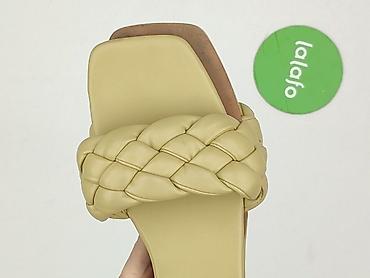 Damskie klapki letnie - Model: wsuwane, z krzyżującymi się paskami - Kolor: beżowe podeszwy i cholewka z żółtymi, plecionymi paskami z dekoracyjną lamówką - Rozmiar: 39 (oznaczenie „39” na wkładce...