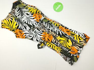 Kombinezon damski Billie & Blossom Petite w rozmiarze 10, wyprodukowany w Turcji. Fason bez rękawów, z okrągłym dekoltem, idealny na ciepłe dni. Kombinezon posiada wzór z liści w odcieniach czerni, zieleni, pomarańczu i żółci, uzupełniony o detale w lamparcie cętki. W talii wiązany pasek, który podkreśla sylwetkę.