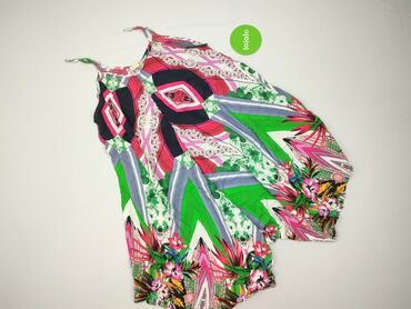 Kombinezon damski w rozmiarze S, o luźnym kroju, z krótkimi nogawkami i szerokimi ramiączkami. Wykonany z lekkiego materiału w kolorze czarnym z tropikalnym wzorem zielonych liści. Posiada wiązanie...