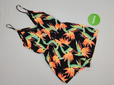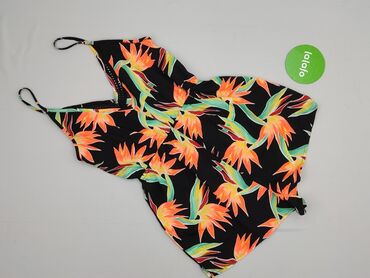 - Wzór: tropikalny, duże kwiaty w odcieniach pomarańczu, żółci i zieleni na czarnym tle