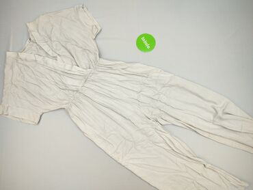 Kombinezon damski, kolor ecru/kremowy. - Fason: długi kombinezon z nogawkami, dekolt w kształcie litery V z przodu, krótkie bufiaste rękawy. - Zapięcie: z tyłu rozcięcie z wstawką i ozdobną agrafk...