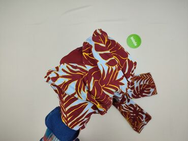 - Wzór: tropikalne liście monstera i hibiskusa; kolory – bordo, jasny błękit i akcenty żółte