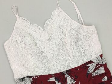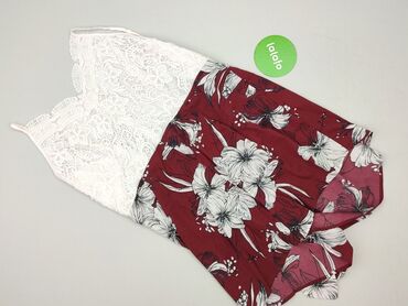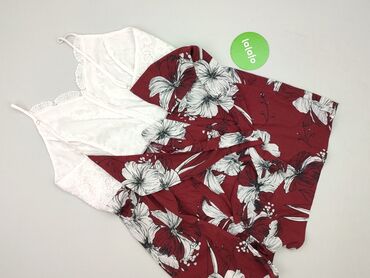 Krótki kombinezon damski marki New Look, w odcieniu czerwieni z białym kwiecistym wzorem. Model z odkrytymi ramionami i falbanką, posiadający cienkie ramiączka, które można zawiązać na szyi. Elasty...