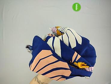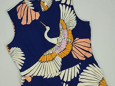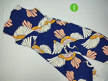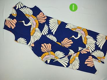 Kombinezon damski bez rękawów z szerokimi nogawkami. Granatowa baza z dużym, efektownym nadrukiem żurawi i wachlarzy w kolorach ecru, brzoskwiniowym, różowym i musztardowym.