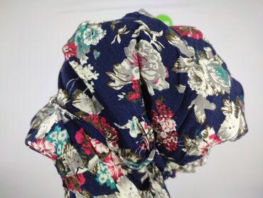 - Wzór: gęsty, wielobarwny nadruk kwiatowy na granatowym tle (odcienie ecru, różu, zieleni, turkusu)