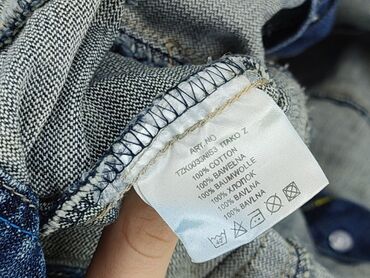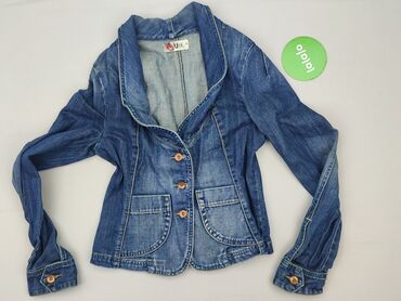 Kurtka dżinsowa damska - Klasyczny, przedłużany fason z kołnierzem - Denim w średnim niebieskim odcieniu z delikatnymi przetarciami - Zapięcie na metalowe guziki z tłoczeniem - 2 kieszenie piersio...