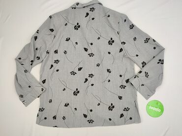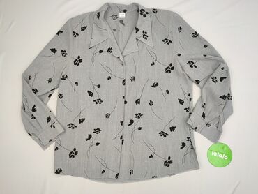 Szara koszula damska z krótkim rękawem i kwiatowym nadrukiem line-art (czarne, subtelne kontury). - Fason: luźny, koszulowy, zapinany z przodu na rząd guzików w kolorze tkaniny - Kołnierz: wykład...
