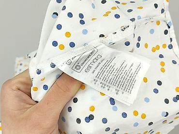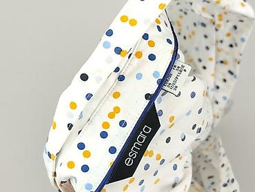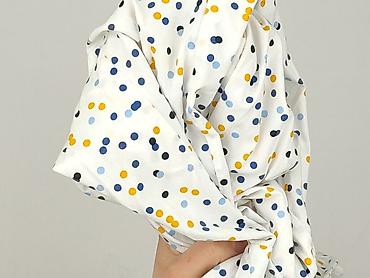 - Wzór: białe tło w kropki w odcieniach granatu, błękitu, żółci i czerni