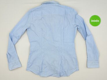 Koszula damska H&M - Krój: klasyczna koszula z kołnierzykiem, długi rękaw - Zapięcie: pełny rząd guzików z przodu; mankiety na guzik - Wzór: cienkie pionowe paski w kolorze niebieskim i białym - R...Stan: