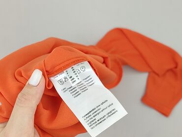 Bluzka damska z długim rękawem, kolor brzoskwiniowy/łososiowy. - Krój: luźny, prosty, lekko wydłużony dół. - Dekolt: w serek z szeroką listwą i stójką. - Rękawy: długie, mankiety zapinane na pojed...
