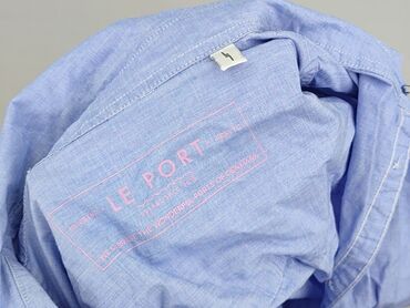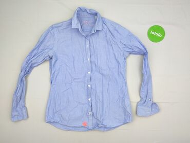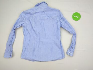 Jasnoniebieska koszula damska o kroju dopasowanym, wykonana z materiału przypominającego jeans. Charakteryzuje się długimi rękawami zakończonymi mankietami zapinanymi na guziki, klasycznym kołnierz...Stan: