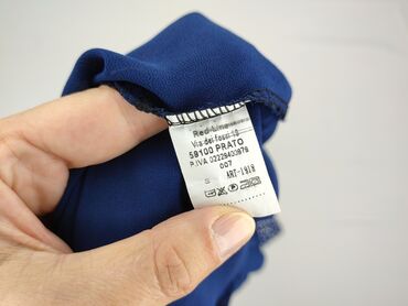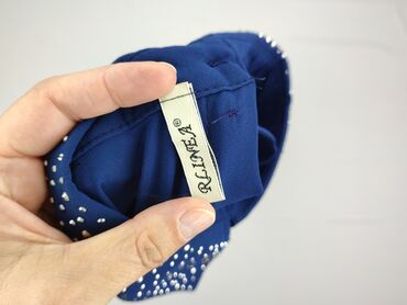 Bluzka damska w kolorze kobaltowym z krótkim rękawem. Lekko prześwitująca, zwiewna tkanina. Charakterystyczny, biały kołnierzyk typu Peter Pan ozdobiony metalowymi, złotymi nitami/dżetami. Zapięcie...Stan: