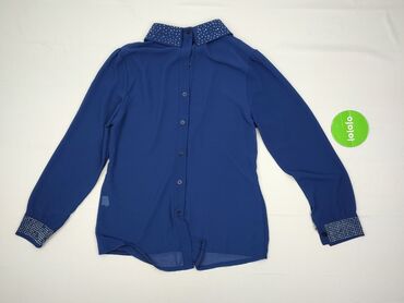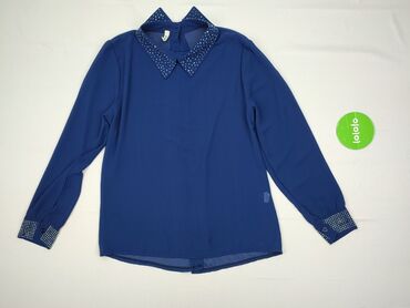 Bluza/koszula damska z długim rękawem w kolorze granatowym. - Rozmiar: L (metka na zdjęciu) - Krój: luźniejszy, zaokrąglony dół, lekko dłuższy tył - Dekolt: stójka zapinana z tyłu na dwa guziki, z ...