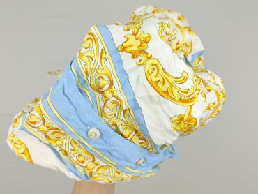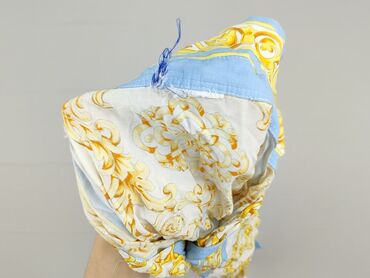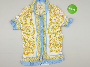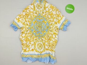 Krótki rękawDamska koszula z krótkim rękawem, ozdobiona wzorem w stylu barokowym. Dominują kolory biały, złoty i błękitny. Kołnierz i mankiety wykończone są błękitnym materiałem, podobnie jak plisa z zapięciem na guziki. Koszula posiada klasyczny krój, idealny do noszenia na co dzień lub na specjalne okazje, dodając elegancji każdej stylizacji.