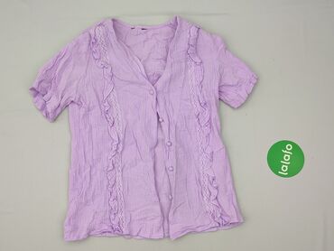 Krótki rękawFioletowa koszula damska z krótkim rękawem, wykonana z teksturowanego materiału. Charakteryzuje się dekoltem w kształcie litery V oraz zapięciem na guziki z przodu. Ozdobne falbanki i wstawki z koronki wzdłuż zapięcia dodają jej uroku. Rękawy są krótkie i lekko bufiaste, zakończone elastycznymi mankietami. Idealna do noszenia na co dzień w cieplejsze dni.