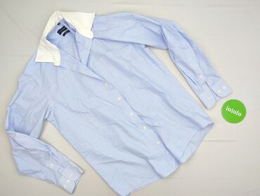 Koszula damska w paski - Krój: klasyczna koszula zapinana na guziki z kołnierzykiem, długie rękawy z mankietami na guziki - Wzór: drobne pionowe paski w kolorze błękitno-białym - Rozmiar z metki: ...