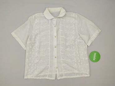 Biała damska koszula/bluzka z krótkim rękawem - Klasyczny krój, zapinana z przodu na cztery guziki - Ozdobny kołnierzyk z ażurową aplikacją - Mała kieszonka na piersi z dekoracyjną wstawką ażurową...