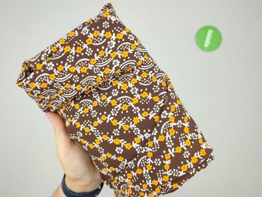 - Wzór: drobne kwiaty i ornamentalne motywy w kolorach bieli i żółci na brązowym tle; pionowe panele wzoru wysmuklające sylwetkę
