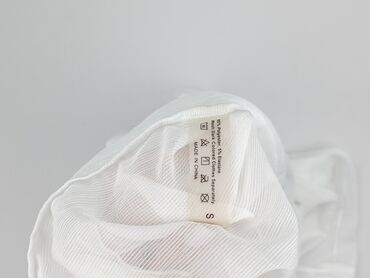 Biała koszula damska z krótkim rękawem, r. M - Fason: prosta, lekko luźna, z rozcięciami po bokach u dołu - Zapięcie: na guziki z przodu - Kołnierz: szeroki, spiczasty - Rękaw: krótki - Detale: dw...