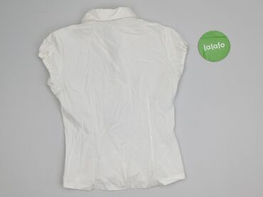 Biała koszula damska z krótkim rękawem, r. M - Fason: prosta, lekko luźna, z rozcięciami po bokach u dołu - Zapięcie: na guziki z przodu - Kołnierz: szeroki, spiczasty - Rękaw: krótki - Detale: dw...