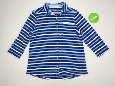 Koszula damska w paski L/XL - Fason: klasyczna koszula zapinana na guziki, kołnierzyk, zaokrąglony dół - Kolor/wzór: biało–błękitne pionowe pasy, ażurowe wstawki wzdłuż pasów - Materiał: 100% bawe...