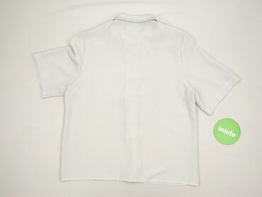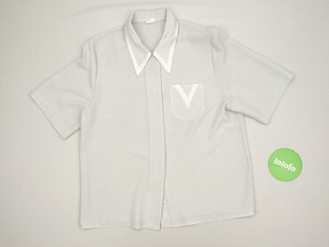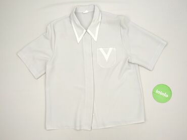 Biała koszula damska z krótkim rękawem, r. M - Fason: prosta, lekko luźna, z rozcięciami po bokach u dołu - Zapięcie: na guziki z przodu - Kołnierz: szeroki, spiczasty - Rękaw: krótki - Detale: dw...