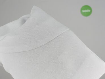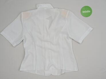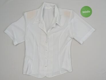 Biała koszula damska z krótkim rękawem, r. M - Fason: prosta, lekko luźna, z rozcięciami po bokach u dołu - Zapięcie: na guziki z przodu - Kołnierz: szeroki, spiczasty - Rękaw: krótki - Detale: dw...
