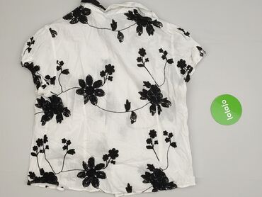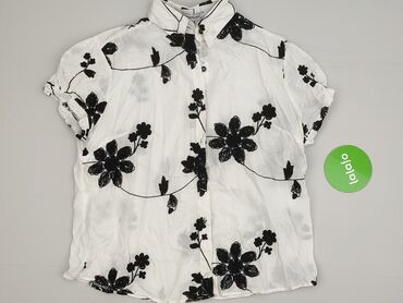 Biała koszula damska z krótkim rękawem - Fason: luźna, zapinana na guziki z przodu - Kołnierzyk klasyczny - Krótkie rękawy zakończone delikatną falbanką - Ozdoba: naszyta aplikacja-kwiat na piersi...Stan: