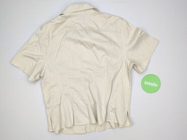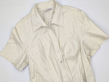 Beżowa koszula damska z krótkim rękawem - Fason: prosta, lekko pudełkowa sylwetka, zapinana na 5 guzików z przodu - Kołnierzyk: klasyczny - Rękaw: krótki - Dół: delikatne rozcięcia po bokach - Mat...