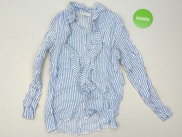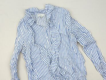 Koszula damska w paski - Krój: zapinana na guziki z długim rękawem - Kolor/wzór: drobne biało‑niebieskie paski - Detale: falbanka wzdłuż zapięcia oraz przy stójce/kołnierzyku, mankiety na guzik - ...Stan: