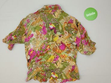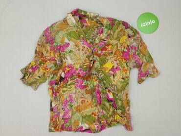 Koszula damska z krótkim rękawem, zapinana na guziki. - Krój luźny, prosta linia ramion, kołnierzyk klasyczny. - Tkanina cienka, przewiewna, o wyraźnej fakturze (lekko kreszowana). - Wzór: kolorow...Stan: