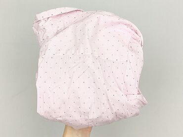 - Kolor i wzór: jasnoróżowa w cienkie białe paski z drobnymi kropkami; kontrastowe ciemne guziki