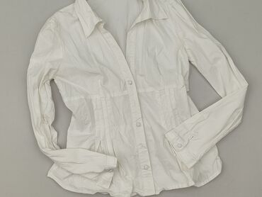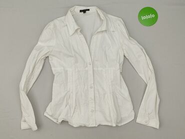 Biała koszula damska z długim rękawem i kołnierzykiem, rozmiar 36 (etikieta: WOMEN 36). - Materiał: cienka, lekka tkanina o delikatnej fakturze. - Krój: luźniejszy, zaokrąglony dół. - Zapięcie: wią...