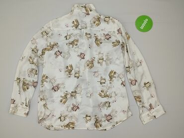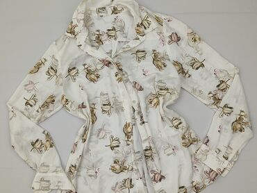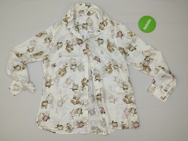 Koszula damska z długim rękawem - Kolor: biel z beżowym, powtarzalnym nadrukiem (litera „L”, kwiatki, korony, geometryczne motywy) - Krój: klasyczny, zapinana na guziki z przodu, kołnierzyk, manki...Stan: