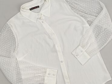 Biała koszula damska z koronką - Krój: zapinana na guziki z przodu, klasyczny kołnierzyk - Materiał: półtransparentna tkanina z koronkowymi wstawkami na całym przodzie i tyle; gładkie, lekko prześ...