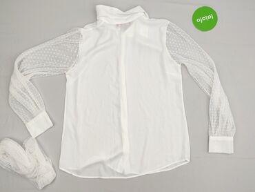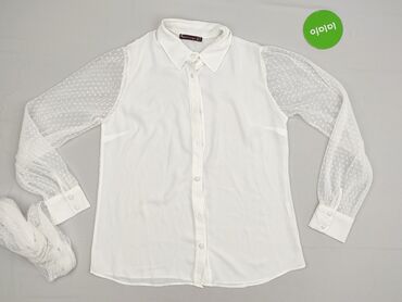 Biała koszula damska z koronką - Krój: zapinana na guziki z przodu, klasyczny kołnierzyk - Materiał: półtransparentna tkanina z koronkowymi wstawkami na całym przodzie i tyle; gładkie, lekko prześ...Stan: