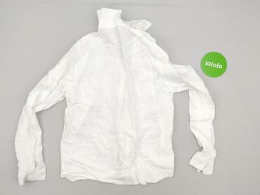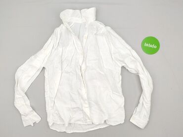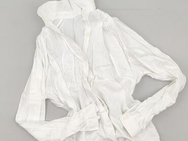 Biała koszula damska z elastycznym ściągaczem w talii, rozmiar L. - Krój: koszulowy, lekko dopasowany w pasie dzięki szerokiemu ściągaczowi z tyłu, zaokrąglony dół. - Rękawy: długie, bufiaste, zak...