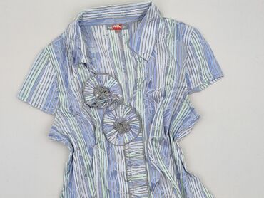 Koszula damska w paski - Krój: klasyczna koszula zapinana na guziki z kołnierzykiem, długie rękawy z mankietami na guziki - Wzór: drobne pionowe paski w kolorze błękitno-białym - Rozmiar z metki: ...