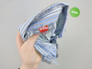 Koszula damska WIBs, rozmiar 40. - Fason: taliowana, z długim rękawem - Wzór: drobne biało‑niebieskie prążki - Kołnierzyk: klasyczny - Zapięcie: guziki na listwie, kontrastowa granatowa wstawka pr...Stan: