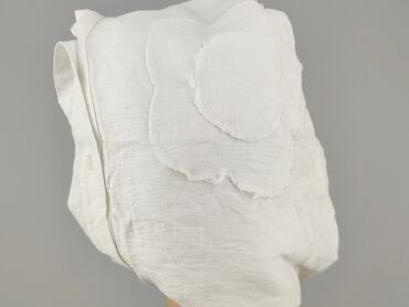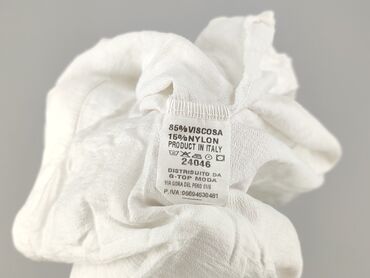 Biała koszula damska z krótkim rękawem - Materiał: lekka, przewiewna tkanina przypominająca len/bawełnę - Krój: luźny, lekko pudełkowy; obniżona linia ramion; zaokrąglony dół - Zapięcie: pełna lis...