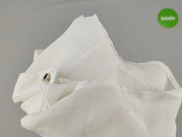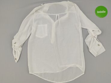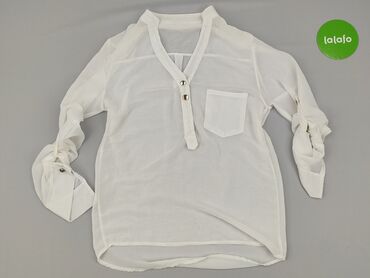 Biała koszula damska z krótkim rękawem, r. M - Fason: prosta, lekko luźna, z rozcięciami po bokach u dołu - Zapięcie: na guziki z przodu - Kołnierz: szeroki, spiczasty - Rękaw: krótki - Detale: dw...