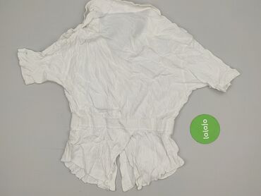 Biała bluzka damska zapinana na guziki - Krój: lekko taliowany, z dekoltem w kształcie litery V - Rękaw: krótki, luźniejszy - Zapięcie: przód na 4 guziki - Tkanina: cienka, przewiewna, z delikatny...