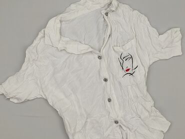 Biała koszula/bluzka damska z krótkim rękawem i kołnierzykiem. Zapinana na przodzie na guziki w paski. Na piersi naszyta kieszonka z haftem – minimalistyczny kontur twarzy z czerwonym akcentem ust. Materiał o wyraźnej, marszczonej/karbowanej fakturze, miękki i lekki. Dół z tyłu wykończony szeroką gumką, co podkreśla talię i nadaje bluzce falowany, kobiecy kształt. Krótszy fason, asymetryczny dół z rozcięciem z przodu. Idealna do stylizacji casual i artystycznych. Kolor: biały z czarno‑białymi guzikami i czarno‑czerwonym haftem. Dla kobiet.