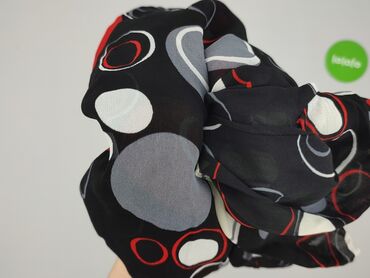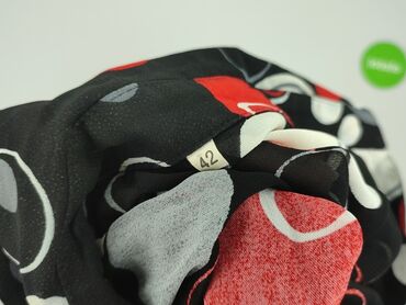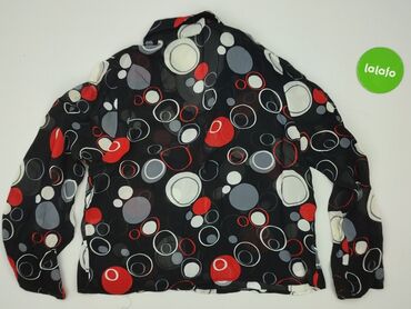 Damska koszula/bluzka z długim rękawem, zapinana na guziki. Cienka, lekko prześwitująca tkanina o miękkim chwycie. Wzór: abstrakcyjne kółka w kolorach czerwieni, bieli i szarości na czarnym tle. Klasyczny kołnierzyk, mankiety na guziki. Rozmiar z metki: 42. Idealna do stylizacji biurowych i casualowych – świetnie wygląda zarówno wpuszczona w spodnie czy spódnicę, jak i noszona luźno. Kolory nasycone, nadruk wyrazisty.