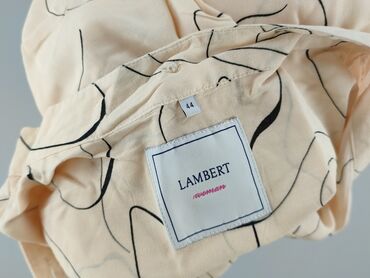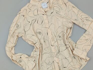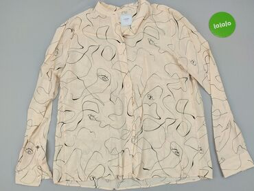 Koszula damska w rozmiarze XL, z krótkimi rękawami, w odcieniach beżu i kremu. Charakteryzuje się unikalnym wzorem geometrycznym w kolorze grafitowym, rozmieszczonym pionowo po obu stronach zapięci...