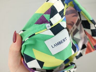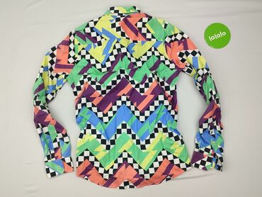 Koszula damska z długim rękawem, zapinana na guziki. Wykonana z lekkiej, cienkiej tkaniny. Wyrazisty, geometryczny wzór w liście/łezki w kolorach zielonym, różowym, brązowym i ecru. Klasyczny kołni...
