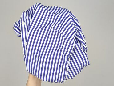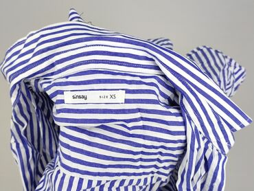 Koszula damska Sinsay, r. S - Fason: klasyczna koszula zapinana na guziki - Rękaw: długi, mankiety na guziki - Kołnierz: stójka - Wzór: pionowe paski w kolorze kobaltowym i białym - Długość: lekko...