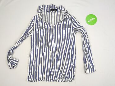 Koszula damska Atmosphere w paski - Model: koszula z kołnierzykiem, zapinana na guziki - Wzór: białe tło z pionowymi granatowo-niebieskimi pasami (delikatny zygzak w strukturze) - Krój: lekko wydł...