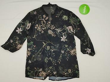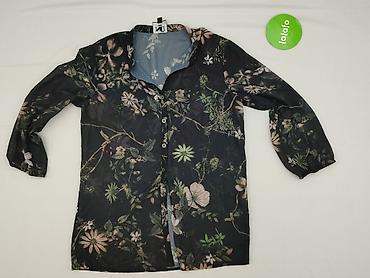 Damska koszula z długim rękawem, rozmiar M. Czarna baza z efektownym, wielobarwnym nadrukiem kwiatowym rozmieszczonym z przodu, na rękawach i z tyłu. Klasyczny kołnierzyk, zapięcie na czarne guziki...